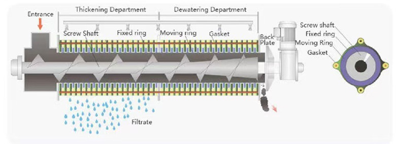 Its core structure comprises a concentration section and a dewatering section. The spiral pushes the sludge, gradually compressing it. The filtrate is discharged through the gaps between the rings, ultimately forming a low-moisture sludge cake. The device operates stably, requiring no filter cloth or centrifugal device, making it suitable for continuous, automated operations.